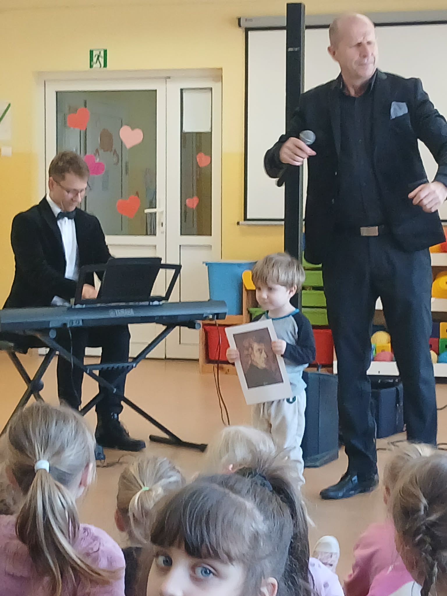 Krople rosy z Żelazowej Woli to wyjątkowe muzyczne spotkanie dla naszych przedszkolaków, które w przystępny i angażujący sposób wprowadziło najmłodszych w świat muzyki oraz postać wybitnego kompozytora – Fryderyka Chopina. Spotkanie miało formę opowieści muzycznej, w której dzieci poznały historię małego Fryderyczka dorastającego w otoczeniu mazowieckiej przyrody, rodzinnego domu i pierwszych dźwięków fortepianu. Podczas zajęć przedszkolaki słuchały wybranych kompozycji Chopina – między innymi Poloneza A-dur, mazurków czy walców – dostosowanych do ich percepcji i wrażliwości. Utwory prezentowane były w formie krótkich fragmentów, przeplatanych opowieścią, ruchem i aktywnym słuchaniem. Dzieci uczyły się rozpoznawać nastrój muzyki, tempo, dynamikę oraz charakter utworów. Zajęcia miały wymiar patriotyczny – w naturalny sposób przybliżyły dzieciom polskie tradycje muzyczne oraz postać kompozytora, który swoją twórczością rozsławił Polskę na całym świecie. Wspominana jest także miejscowość narodzin Chopina – Żelazowa Wola – jako symbol rodzinnych korzeni i inspiracji płynącej z ojczystej ziemi. "Krople rosy z Żelazowej Woli" to spotkanie pełne dźwięków, wyobraźni i emocji, które rozbudzają ciekawość świata muzyki klasycznej, kształtują wrażliwość estetyczną oraz budują pierwsze, piękne skojarzenia z kulturą narodową.