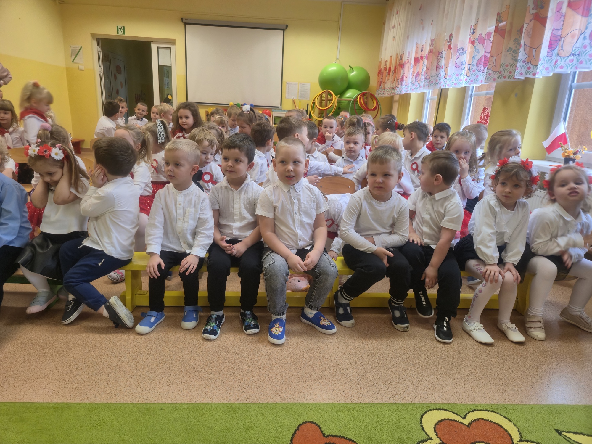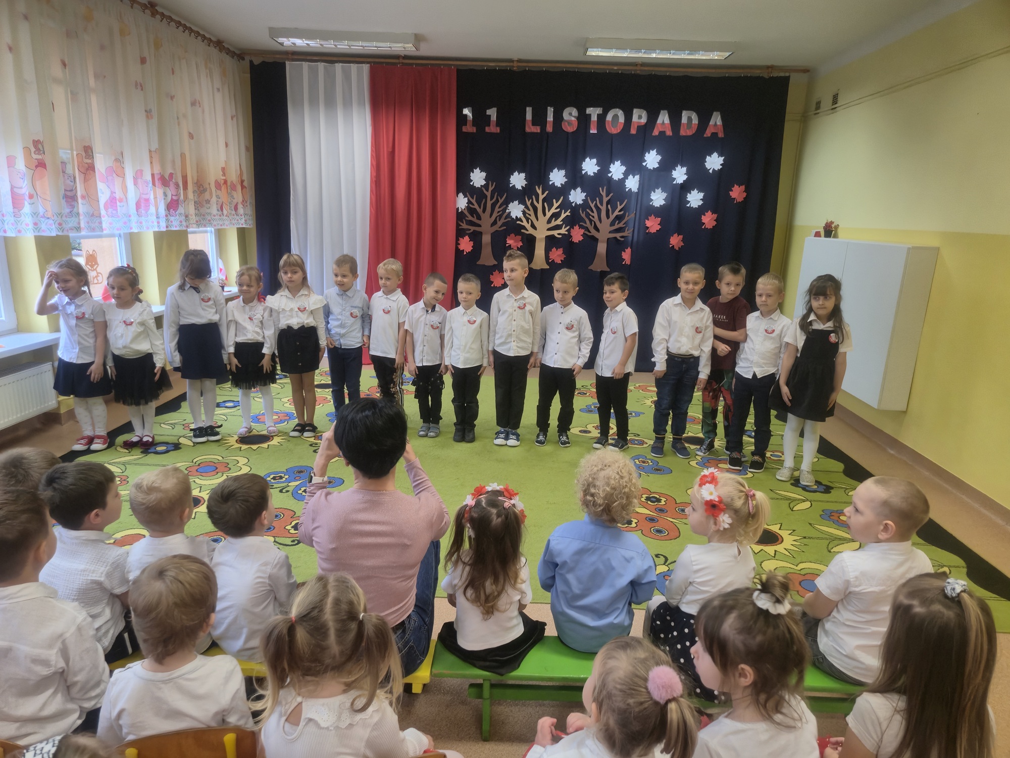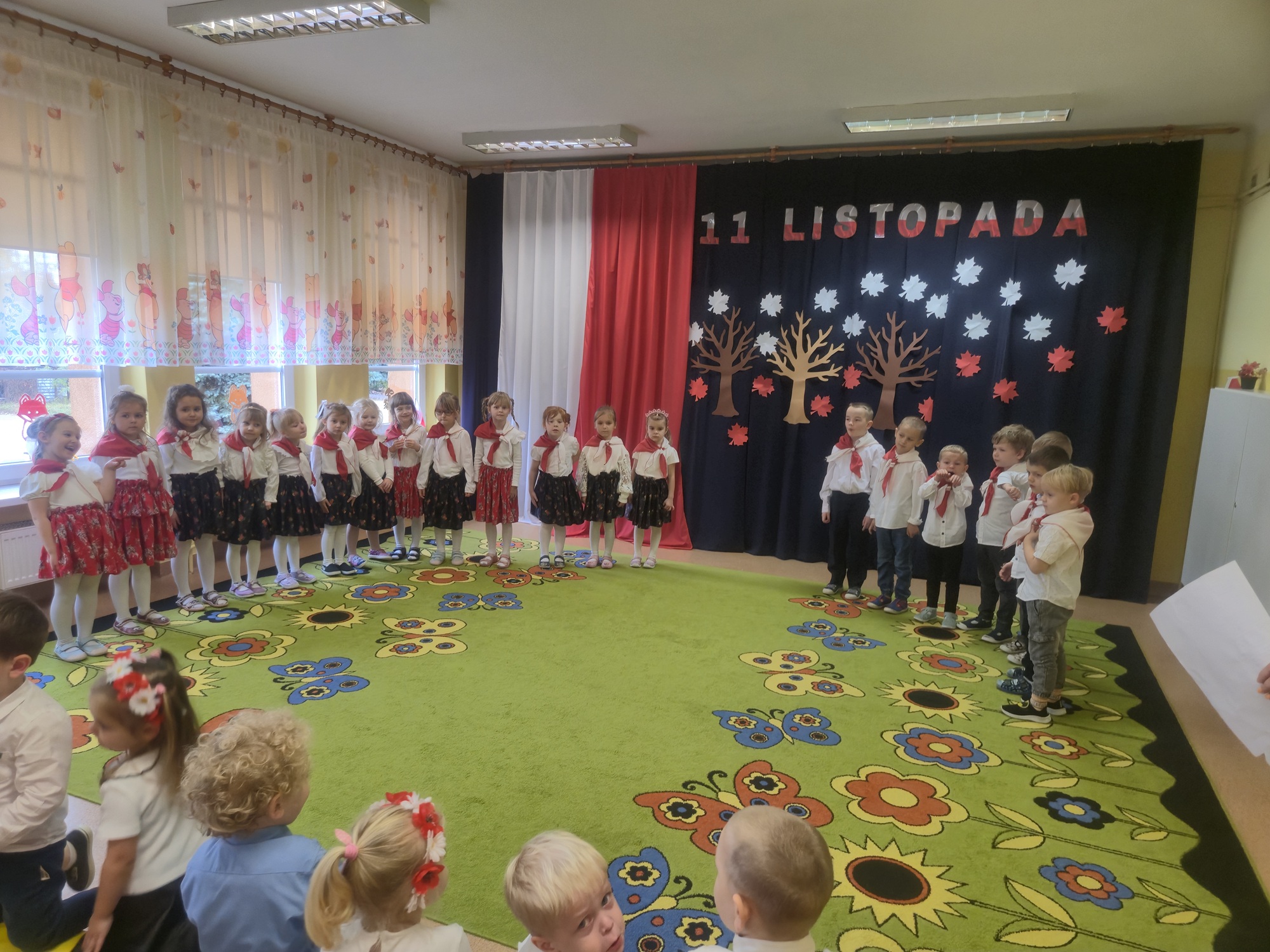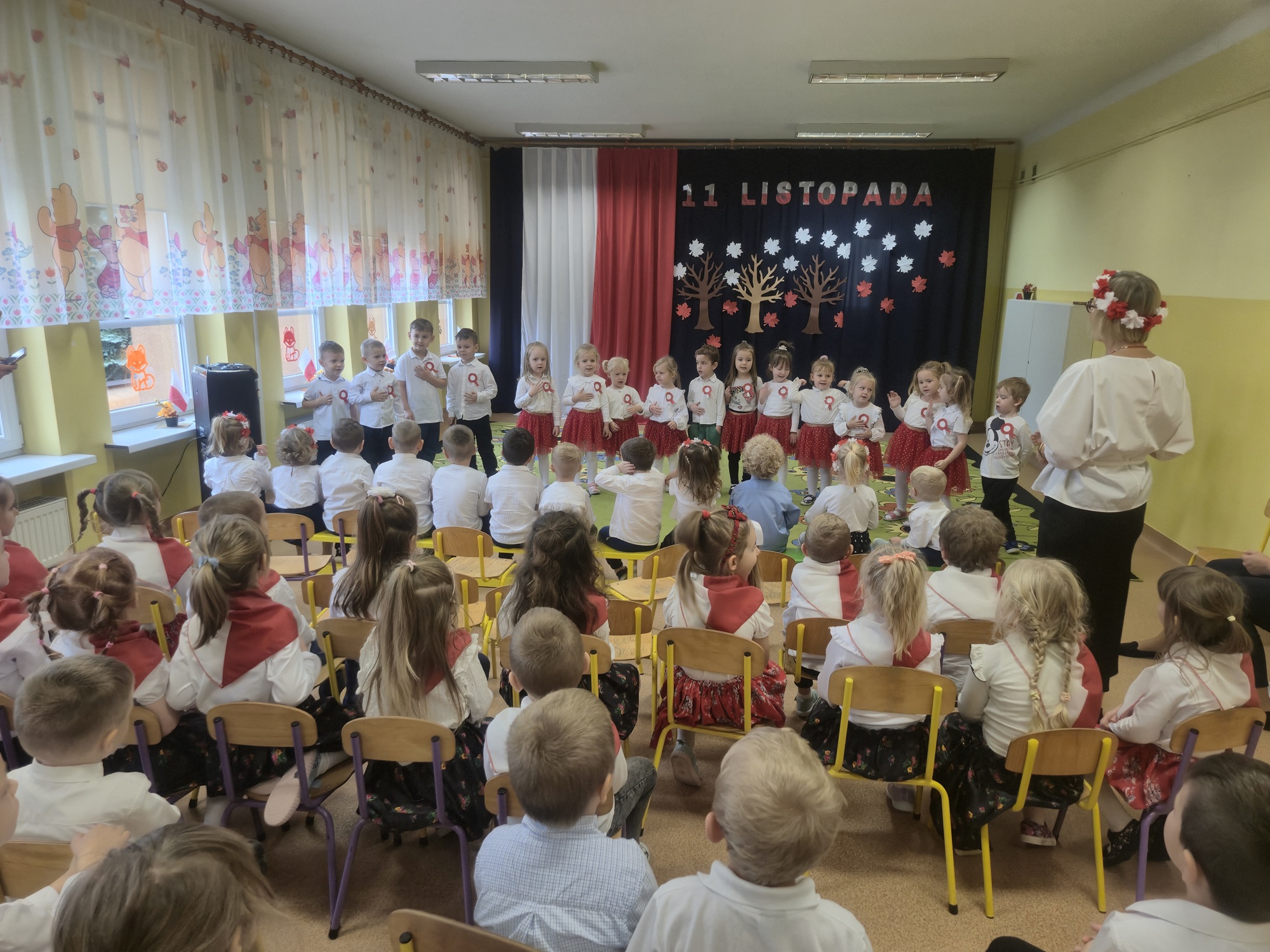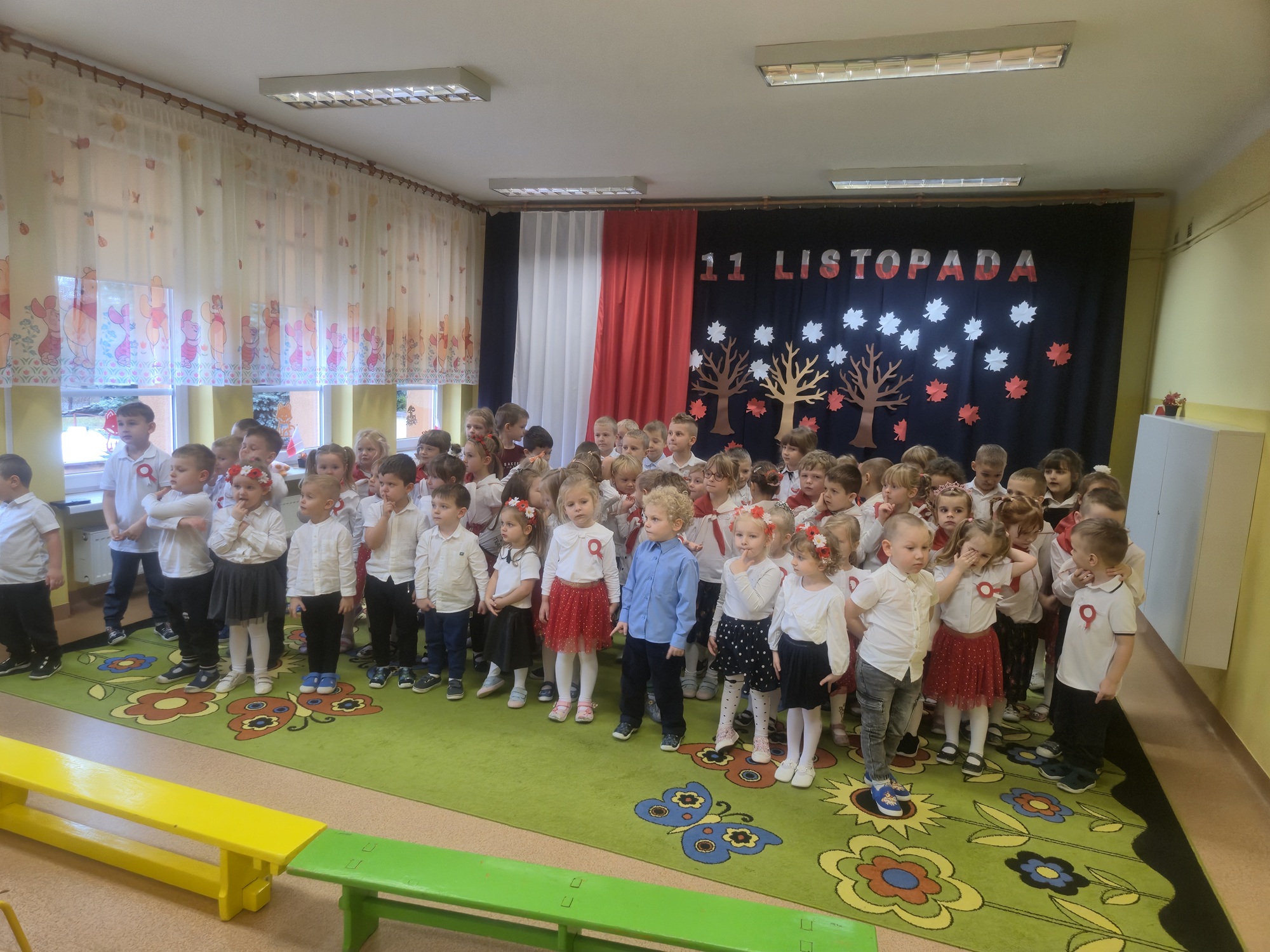 W naszym przedszkolu odbyła się uroczystość z okazji Narodowego Święta Niepodległości, która miała na celu kształtowanie postaw patriotycznych oraz poczucia szacunku do symboli narodowych. Wszystkie dzieci uroczyście świętowały ten wyjątkowy dla Nas – Polaków dzień. Dzieci z każdej grupy zaprezentowały pieśni i piosenki patriotyczne. Na zakończenie wspólnie odśpiewaliśmy hymn „Mazurek Dąbrowskiego”.