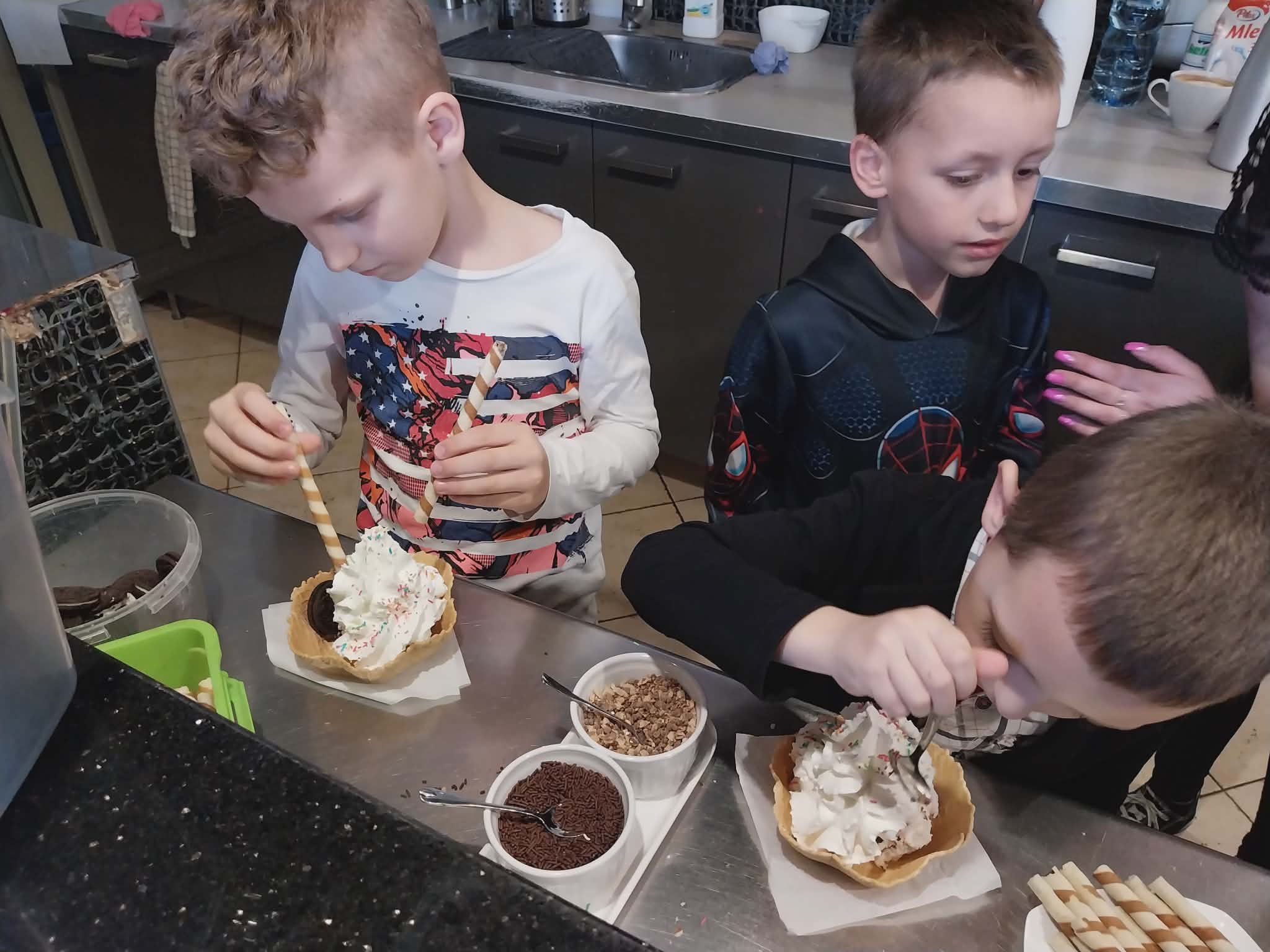 Dzieci poznały tajniki parzenia kawy, przygotowywania pysznych, owocowych soków i lemoniady, uczyły się dekorować słodkości a przy tym świetnie się bawiły. Nie zabrakło uśmiechów, radości i dumy z własnoręcznie wykonanych deserków lodowych.